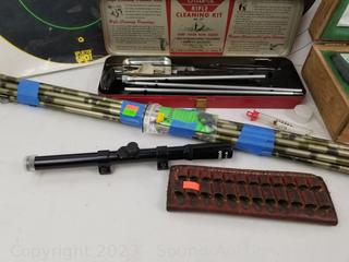Rifle cleaning kit looks to be missing parts, arrows need new flights, Tasco 4x15 scope, Federal Maxum 72110 gauge & various targets. Refer to photos for more info.