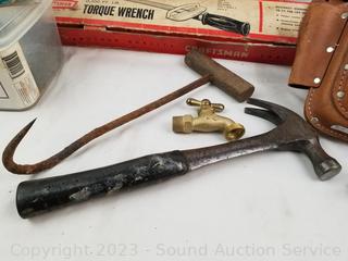 Timing Light, Nails, Screws, Leather Tool Bag, Torque Wrench, Spigot, Hammer, Hay Hook.