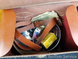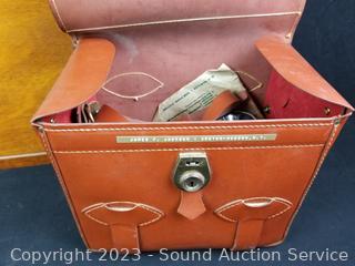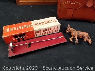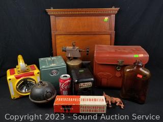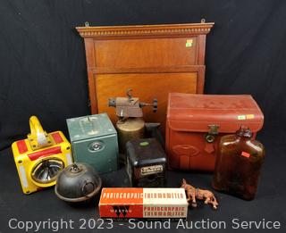 Mahogany Wall pocket, 18" H x 17" W, Weston Thermometer, Leather Camera Case, Vtg. Torch, Vtg. Signal Light, Small Safe & more. Refer to photos for more details.