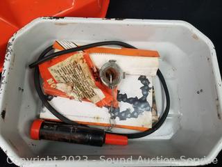 Appears half full of fuel. Small amount of items inside. Rubber seal inside of unit is broken.