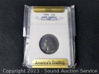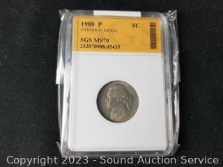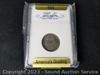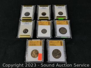 2007P Sacagawea Dollar MS70STN, 2008D Kennedy Half Dollar MS70, 1997D Kennedy Half Dollar MS70, 1988P Jefferson Nickel MS70, 1996D Jefferson Nickel MS70, 1996P Jefferson Nickel MS70, 1999P Jefferson Nickel MS70, 1966 Washington Quarter MS70. ATTN: We are not coin or currency experts or graders, please use your own judgement when bidding.