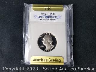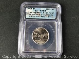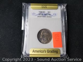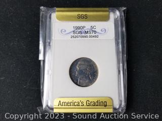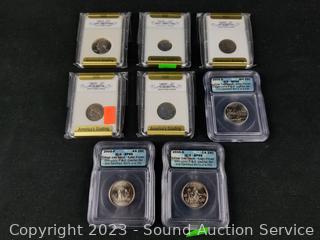 1983D Jefferson Nickel MS70, 1990P Jefferson Nickel MS70, 1984D Jefferson Nickel MS70, 1971S Roosevelt Dime PR70CAM, 1982S Washington Quarter PR70CAM, (2) 2005D FDI Washington Quarter California & Minnesota SP69, 2005P FDI Washington Quarter Kansas SP69. ATTN: We are not coin or currency experts or graders, please use your own judgement when bidding.
