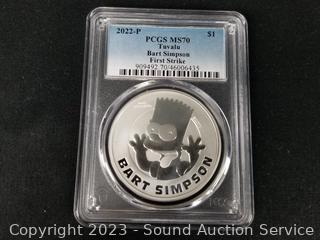 Lot #0225: Graded 2022-P Tuvalu "Bart Simpson" 1oz .9999 Fine Silver First Strike $1 Coin MS70