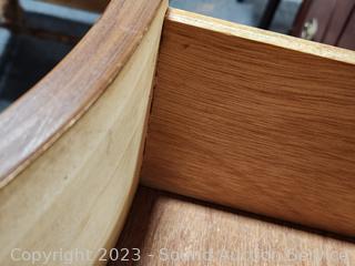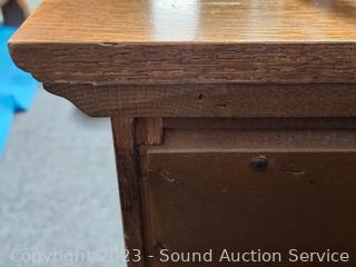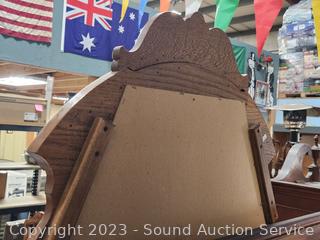 49" H x 50" W mirrored topper, 34" H x 64" W x 21" D. Solid wood construction, dovetail joinery. Beveled mirrored topper has storage. Scrolled accents. A few minor scuffs, scratches, overall great condition.