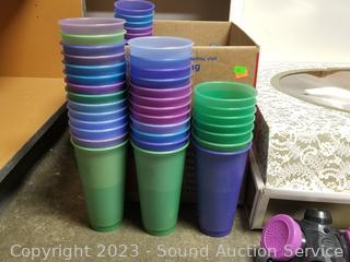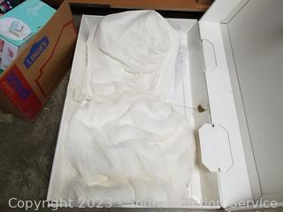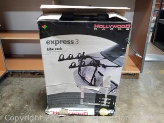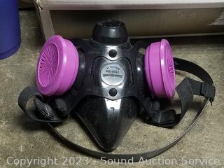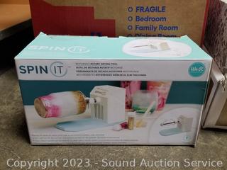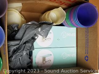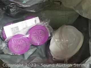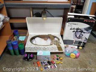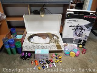 Respirator mask, face masks, plastic party cups with lids, toy cars, several "Spin it" motorized rotary drying tools, Da Vinci wedding gown S:10, Express 3 trunk mount bike rack.