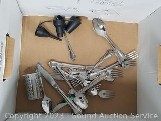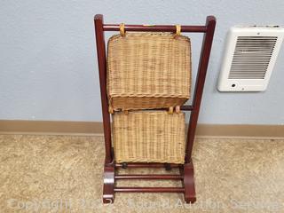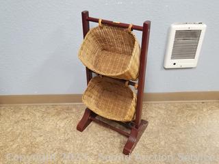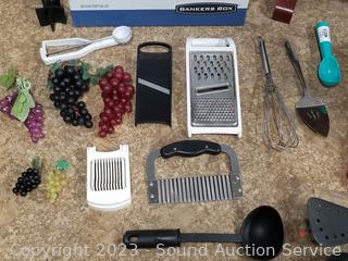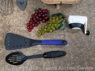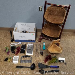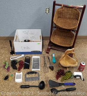 2-tier woven basket rack (30" H x 14.5" W), assorted kitchen utensils, pear shaped fruit bowl, faux grape bushels. Refer to photos for more info.
