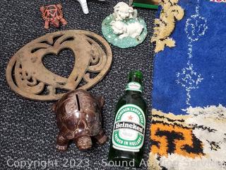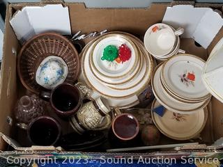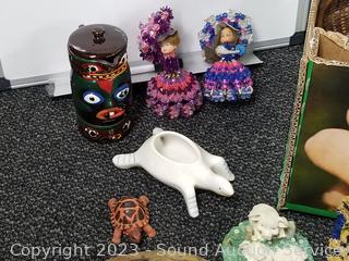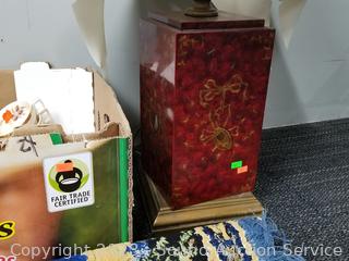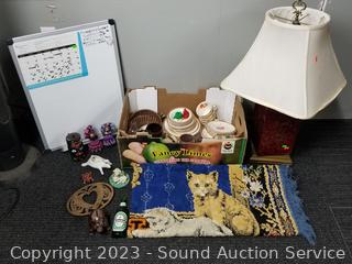 30" table lamp (shade is shredded, works), whiteboard, Triumph American Limoges 22K gold china, mugs, knick-knack, tapestries & more. ATTN: Items may be missing pieces, damaged, not functioning, complete, no issues, etc. All items as is. Refer to photos for lot contents.