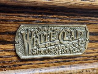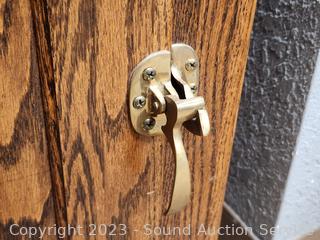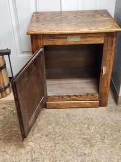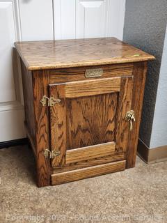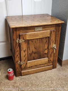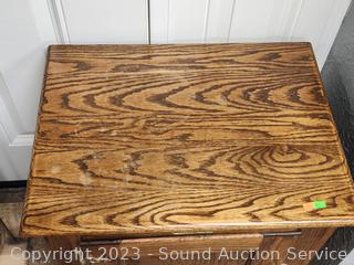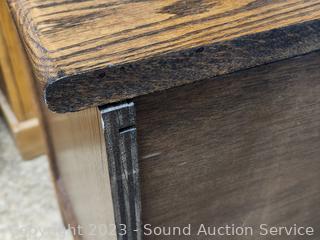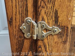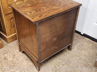 Some wear to the finish on the top. Appears to be solid wood construction. Brass hardware. 24" H x 22" W x 16-3/8" D.