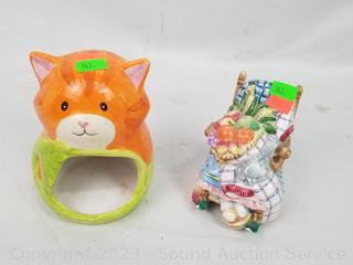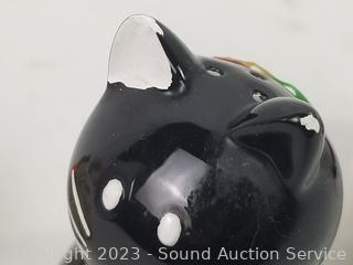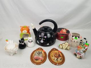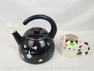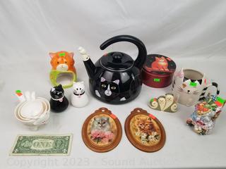 Salt & Pepper Shakers, Teapot, Mug, Measuring Cups & more. Black cat salt & pepper shaker has a chipped ear.