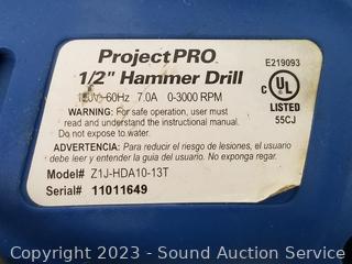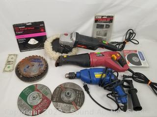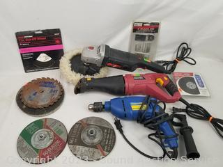 Project Pro 1/2" Hammer Drill, Chicago Elec. Reciprocating Saw, Drill Master Angle Grinder/Buffer, grinding wheels, circular saw blades. All work.