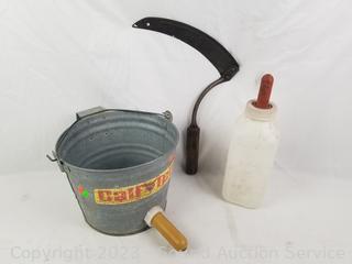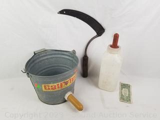 Lot #0148: Hand Scythe, Calf Milk Bottle & Pail