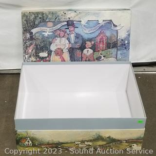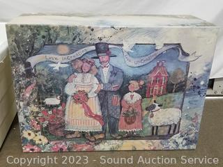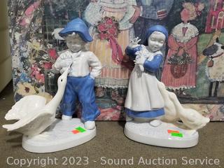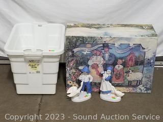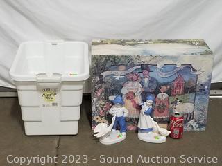 2 Ceramic girl figures, small tote 14" x 14" x 18", decorative box with lid 8" x 22.5" x 16".