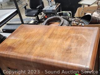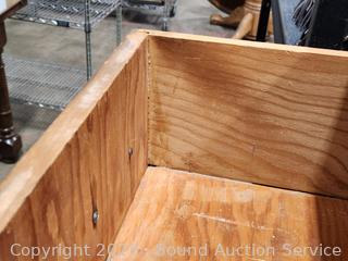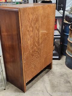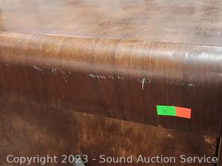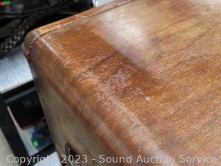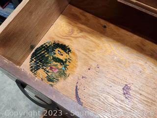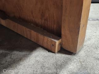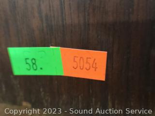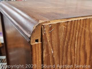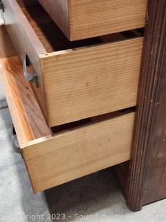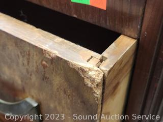 Believe drawers are in the wrong places, top drawer is very stuck. Various wear to finish, scuffs, scratches, some stains in drawers. 52" H x 34" x 19".