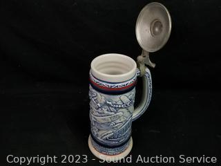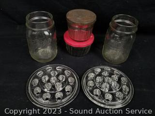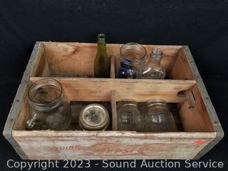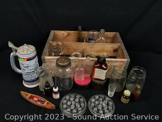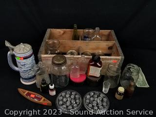Lot #0172: Vintage Wood Crate w/Canning Jars, Mugs, Bottles, Stein