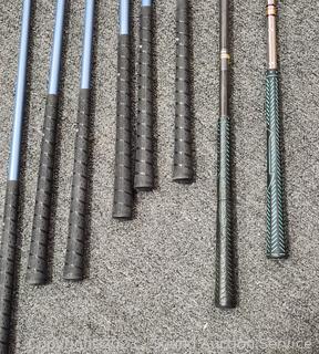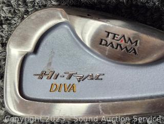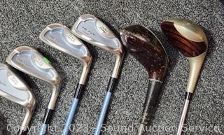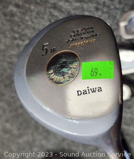Several brands, mostly Daiwa, Northwestern & St. Andrews, Wilson. Putters, P/S, 4/5/6/7/8/9 Irons, 4 drivers. Various wear from use. Physics bag with some golf balls.