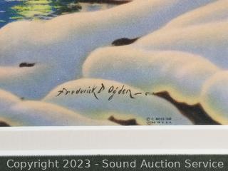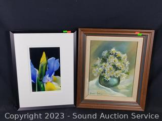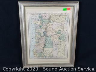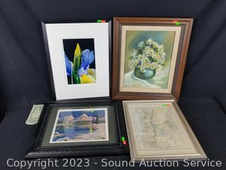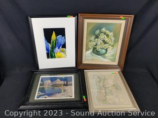 Diane Camley Original Still Life Floral Painting 16" x 19". Pacific Northwest Map 16" x 12.5", Frederick Ogden Litho 14.75" x 18", John M. Signed floral photograph 18.25" x 13.75".