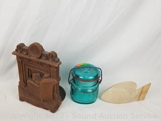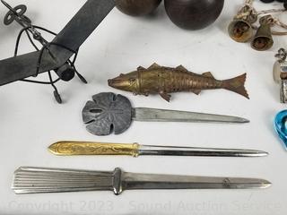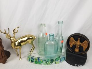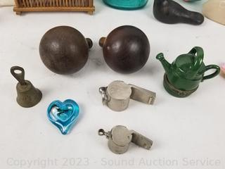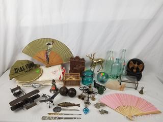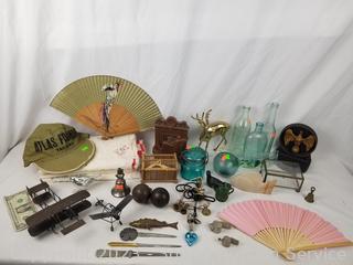 Bottle, jar, glass fishing float, metal art plate, brass deer, wood knobs, whistles, small bells, folding fans, foundry cap & more.
