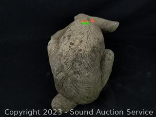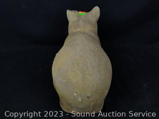 Approx. 9" H x 13" to 16" L x 6.5" to 8.5" W. Cat has a damaged ear.