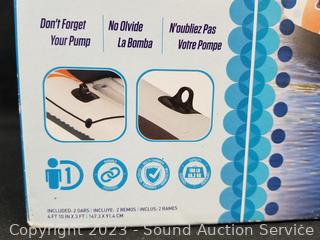 Box is factory sealed. Comes with 2 oars. 4'10" x 3ft inflated.