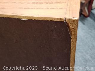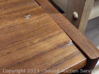 Particle board construction, teak veneer finish. Has damage to veneer on top right side. Don't see any other major issues. 29" H x 30.25" W x 11.25" D.