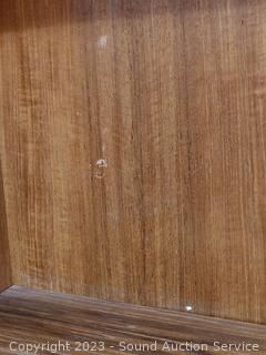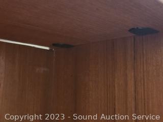 Backing is off track, particle board construction, teak veneer finish. Overall great condition. 60" H x 35" W x 11-3/8" D.