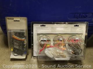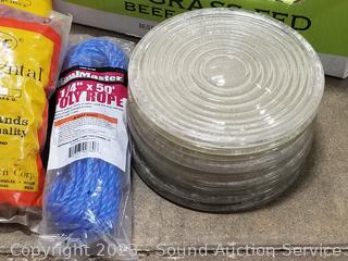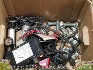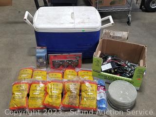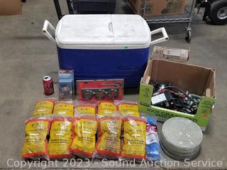 Igloo cooler, 10 bags of rubber bands, trailer light power module, 2.5" x 9-1/6" bolts, 8.25" glass lenses?, 1/4" x 50ft rope & more.