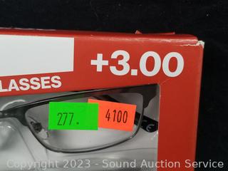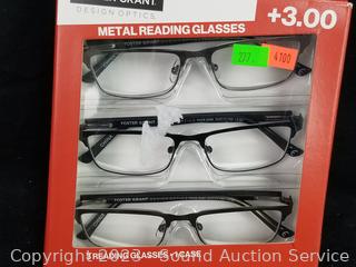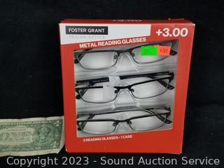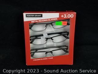 Lot #0277: 3 Foster Grant +3.0 Full Frame Metal Reading Glasses w/1 Case