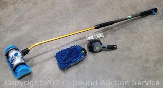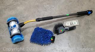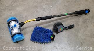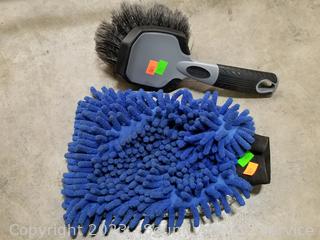 Rim brush, soap scrub brush, cleaning glove. Some signs of wear from use.