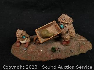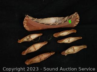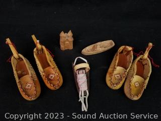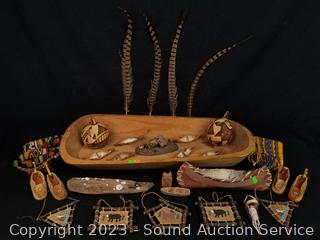 Cloth belts, sash, bark crafted boats, carved gourds, leather baby moccasins, bark dream catchers, feathers, driftwood, hand carved wood bowl 4" x 27" x 11".
