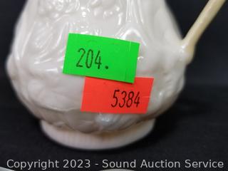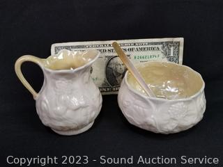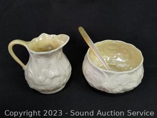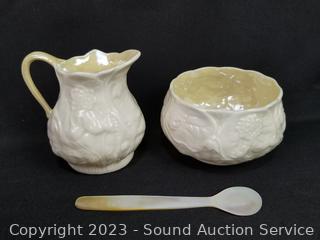 Lot #0204: Belleek Ivory Cream, Sugar & MOP Spoon