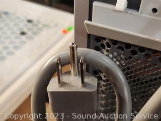 Some sticker residue, don't see any other issues. 12-3/16" H x 20-3/16" W x 14-5/8" D.
