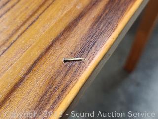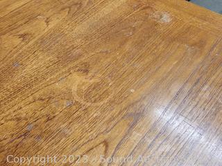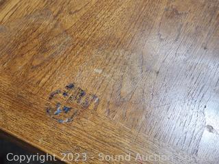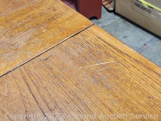 Various wear to finish, mainly on the top when in its smaller state. Spreads out and top folds over to double the length of the table. Some sort of sticky residue in the creases & underside of top. 28.5" x 54.5" L x 35.5" W.