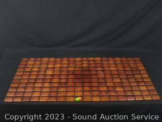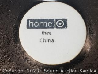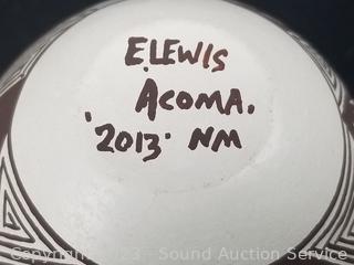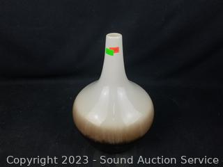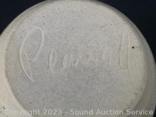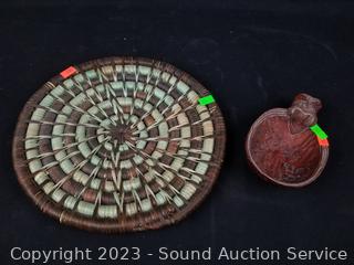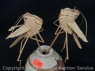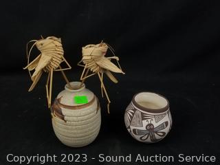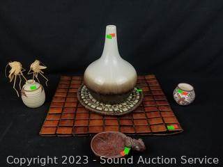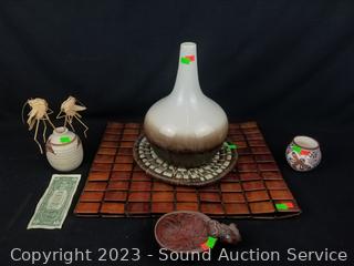 Elewis signed NM pottery vase, hand carved Hawaiian spoon, signed Pearsall pottery vase, 2 hand crafter Locust sticks, woven 10.5" potholder, bamboo table mat 14" x 36", Home glazed pottery vase.