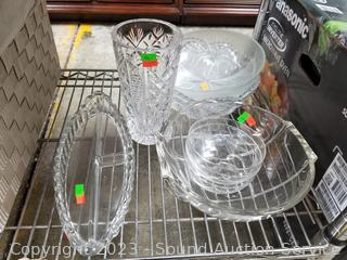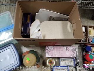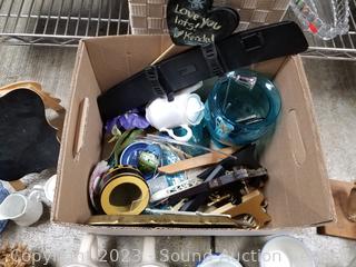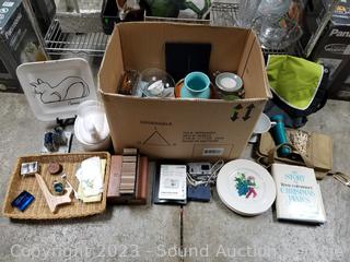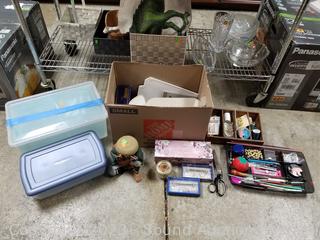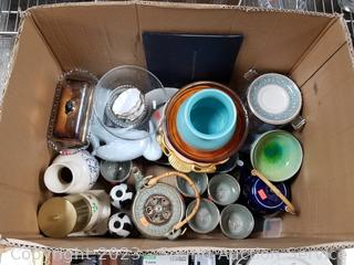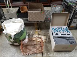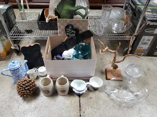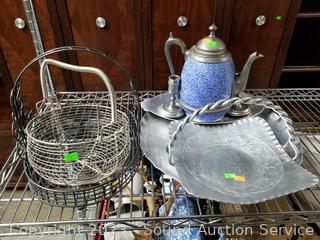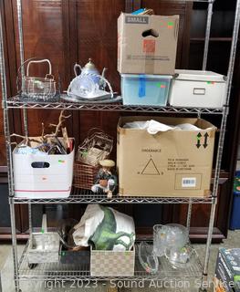 Pottery Japanese figure, ceramic coffee pot, stoneware mugs, aluminum dishes, wire baskets, crystal, glassware, baskets, linens, various other household goods. Cart NOT included. ATTN: Items may be missing pieces, damaged, not functioning, complete, no issues, etc. All items as is. Refer to photos for lot contents.