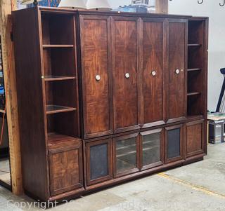 Fits up to 40" H x 64" wide TV. Some minor scuffs, overall in great condition. Appears to be solid wood construction, glass shelves, each section is lighted. Overall 81" H x 103" W x 23.5" D.