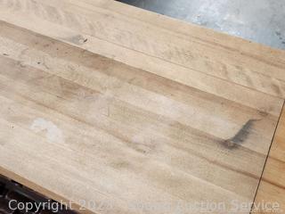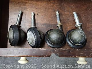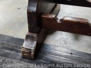 Some scuffs, wear to finish. Comes with casters, not currently attached. 28" H x 29" W x 14" D with 12" leaves on both sides.