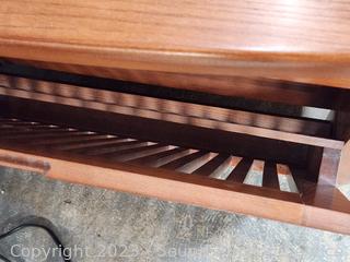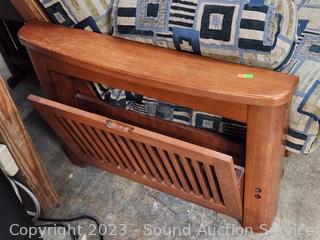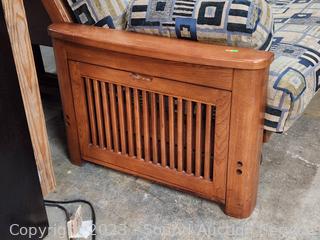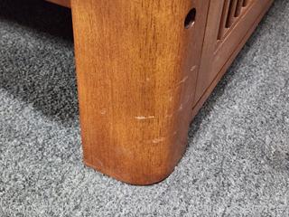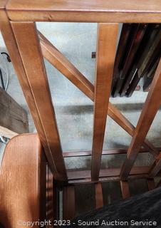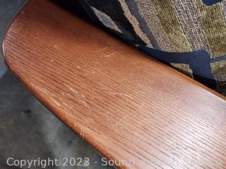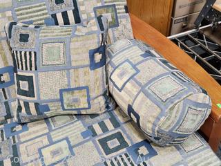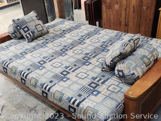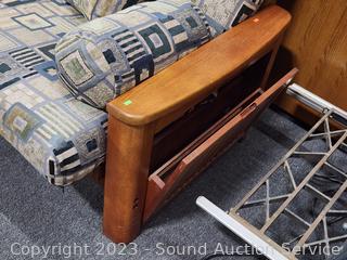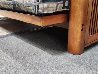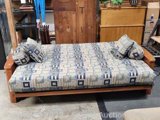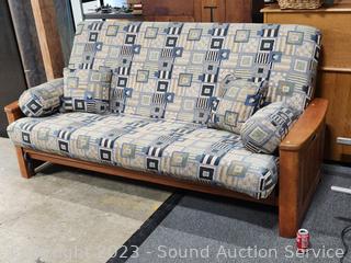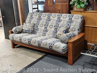Some wear to wood finish, 4 throw pillows. Fold down into approx. full size. Sofa 36" H x 90" L x 33" W x 20" to seat, Futon 52" x 78" x 9".