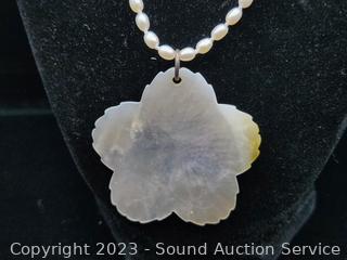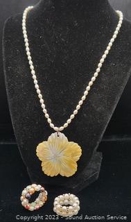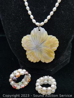Lot #0113: Pearl & Shell Necklace & 2 Pearl Rings