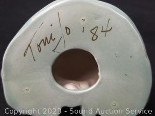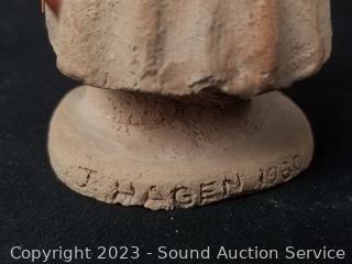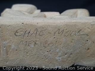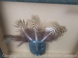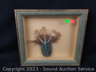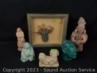 Piece in shadow box is loose, carved stone with feathers, 10" x 11" overall. 3 of the figures/sculptures are signed, 4" to 10" tall. Refer to photos for signatures & more info.