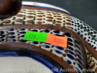 Mexico pottery signed Jonala Santana? Approx. 9.5" tall. Eagle don't see a makers mark, bottom covered in felt, 11.5" tall. Don't see any issues with either.