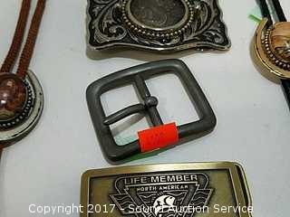 Includes: North American Hunting Club buckle, dragon belt buckle, North American Fishing club buckle, and nice bolo ties.
