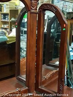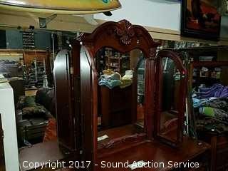 Very nice. Has a tri-fold mirror. Approx. 68" long, 19" deep and 31.5" tall. Mirror is approx. 4ft x 58". Matches the bed frame and cabinet in the next two lots.