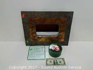 Billiards cue ball coasters with box. Mirror is approx. 16" x 12.5". Nascar piece is 5.5" square. Coasters are 4" in diameter.