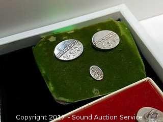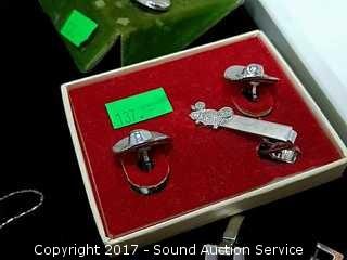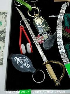 Includes: 2 magnetic therapy bracelets, two sets of cuff links with tie tacks, additional tie tacks, keychains, mini sword and more.
