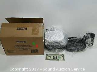 New, box has been opened. Accessories are 7.5" square. Grill pan is 2-3/4" deep. Model 3622.