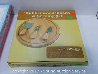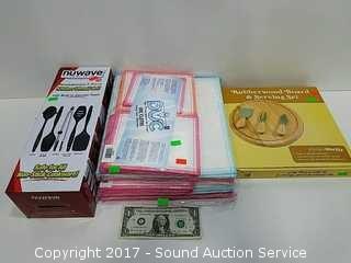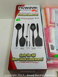 Includes: NIB Nuwave 5 Piece Kitchen Utensil Set, 2 NIP Doc cloths (23 cloths per package), and NIP rubberwood board and serving set, 10" diameter.