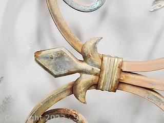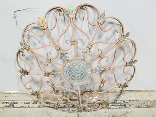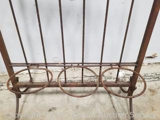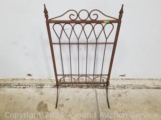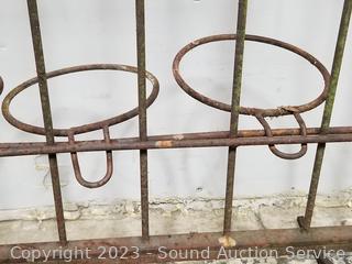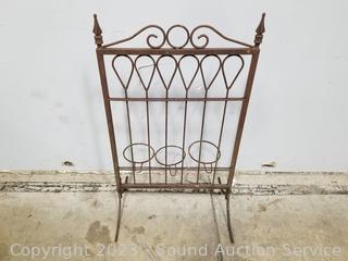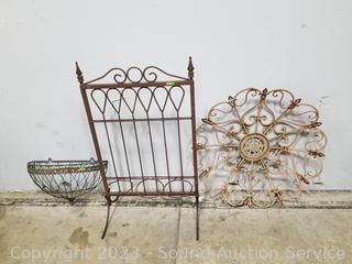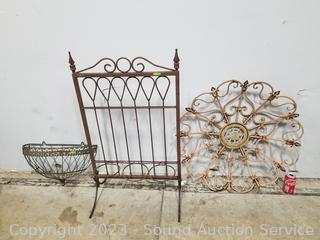 Trellis planter potholder (holds 5.5" pots) 38" x 22", spherical wall hanger 30" Dia, wall mount planter basket 11" H x 20" x 10". Various weathering, rust, wear to finish.