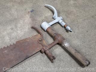 309 Lots including Antique Wood Banded Chest, Rustic Lawn & Garden Decor, Patio Table & chair Sets, Vtg. Crosscut Saws, Vintage/Antique Rustic Tools, Antique Ford Jacks, Model "T" Rims/Tires, Ladies Clothing, Uranium? Glass Biscuit Jar, Concrete Mixer, Gold & Silver Jewelry, Sewing Machine, Wicker Furniture/Decor, Assorted Household Goods, Kitchen Cookware, Camping & Outdoor & Much More!!!