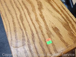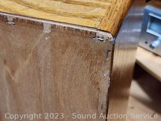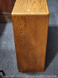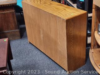 Pressboard construction, oak veneer finish. Some minor wear, 2 adjustable shelves. 30" x 42" x 13".