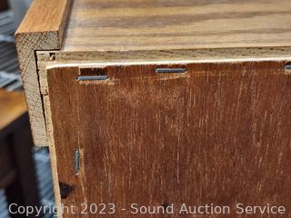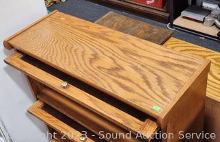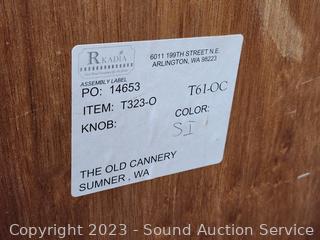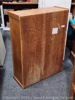 Looks to be both solid wood and pressboard construction, in good condition. 42" x 32" x 12.5".